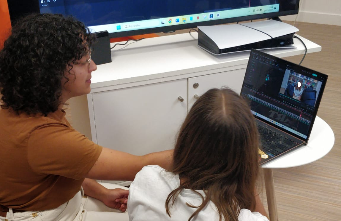 Sur la photo à gauche, on voit Audrey et une participante en train de finaliser le montage de la vidéo Booktube tournée à la bibliothèque de Rebais.